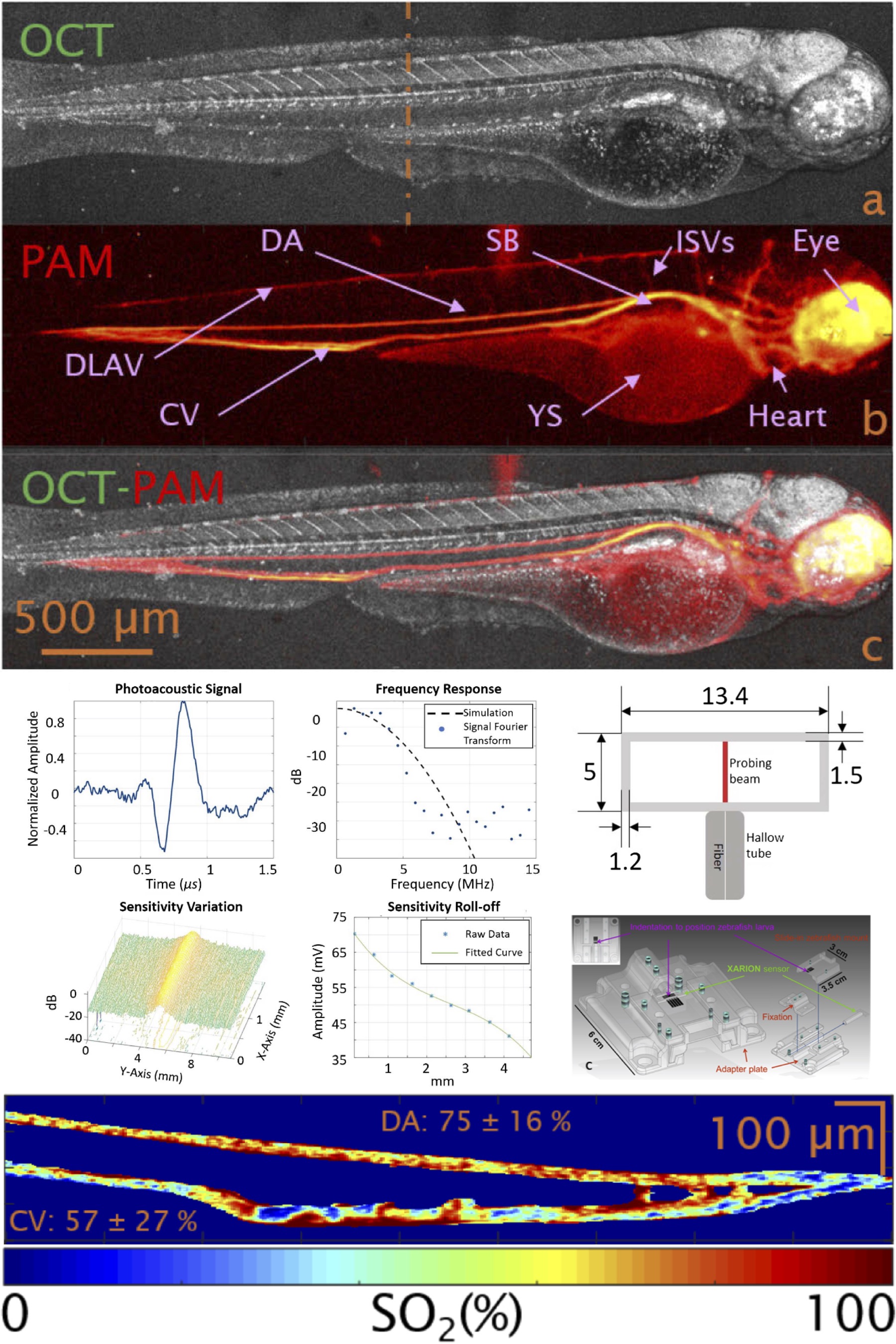Optical resolution photoacoustic microscopy (OR-PAM) is ideally suited for pre-clinical small animal imaging. The sample (e.g. a zebrafish embryo) is illuminated with nanosecond pulsed laser light of various distinct narrow band wavelengths between 532 nm and 620 nm. The laser beam is optically focused and raster scanned along the sample. Therefore, absorbers can be located with a very high precision. Functional parameters, such as blood oxygenation, can be extracted in-vivo. A dual modality image of a zebrafish embryo is shown on top, while the zebrafish mounting concept and characterization of a novel akinetic acoustic sensor is shown in the middle. The bottom image describes the local oxygen saturation in a zebrafish embryo’s tail.