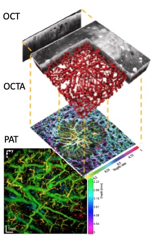 Translating the experimental findings to the clinics and preclinics is an important objective of our activities. In particular we combine the high structural sensitivity of Optical Coherence Tomography with the absorption contrast of PAT. Vascular details from superficial capillaries are seen with OCT Angiography, which are complemented by deeper and larger feeding vessels visualized with PAT. Clinical applications focus on dermatology. See more on multimodal imaging concepts.