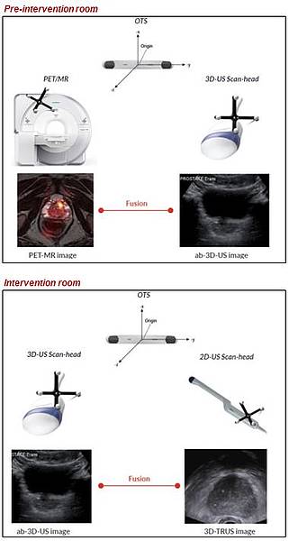 The idea of this project was to develop a real-time navigation system which allows for image fusion between two arbitrary image modalities by replacing the (commonly used) inter-modal registration by an intra-modal 3D-US/3D-US registration and the use of an optical tracking system (OTS). This should avoid well know difficulties arising from inter-modal registration. Such challenges are described for a large variety of modalities. For example, in multi-modality image-guided prostate biopsies, the registration between MR and transrectal-US (TRUS) images is difficult due to the poor signal to noise ratio and lack of well-defined features in US images and the inhomogeneous imaging resolutions. Therefore, the registration is commonly performed using surface-based methods, utilizing image segmentation to address the appearance difference between the two modalities.