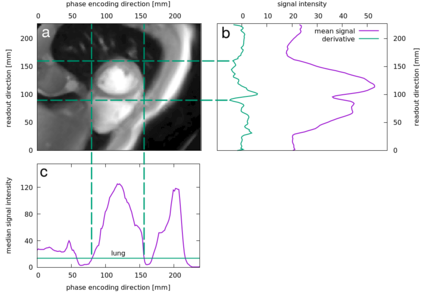Breathing motion is a big issue in cardiac magnetic resonance imaging and spectroscopy. External trackers, such as respiratory belts or even optical cameras can only deliver indirect indication concerning the actual motion of the organs in abdomen. Specialized rapid MRI scans, so-called MR navigators, offer a unique opportunity to gain sufficient information on the motion of internal organs.