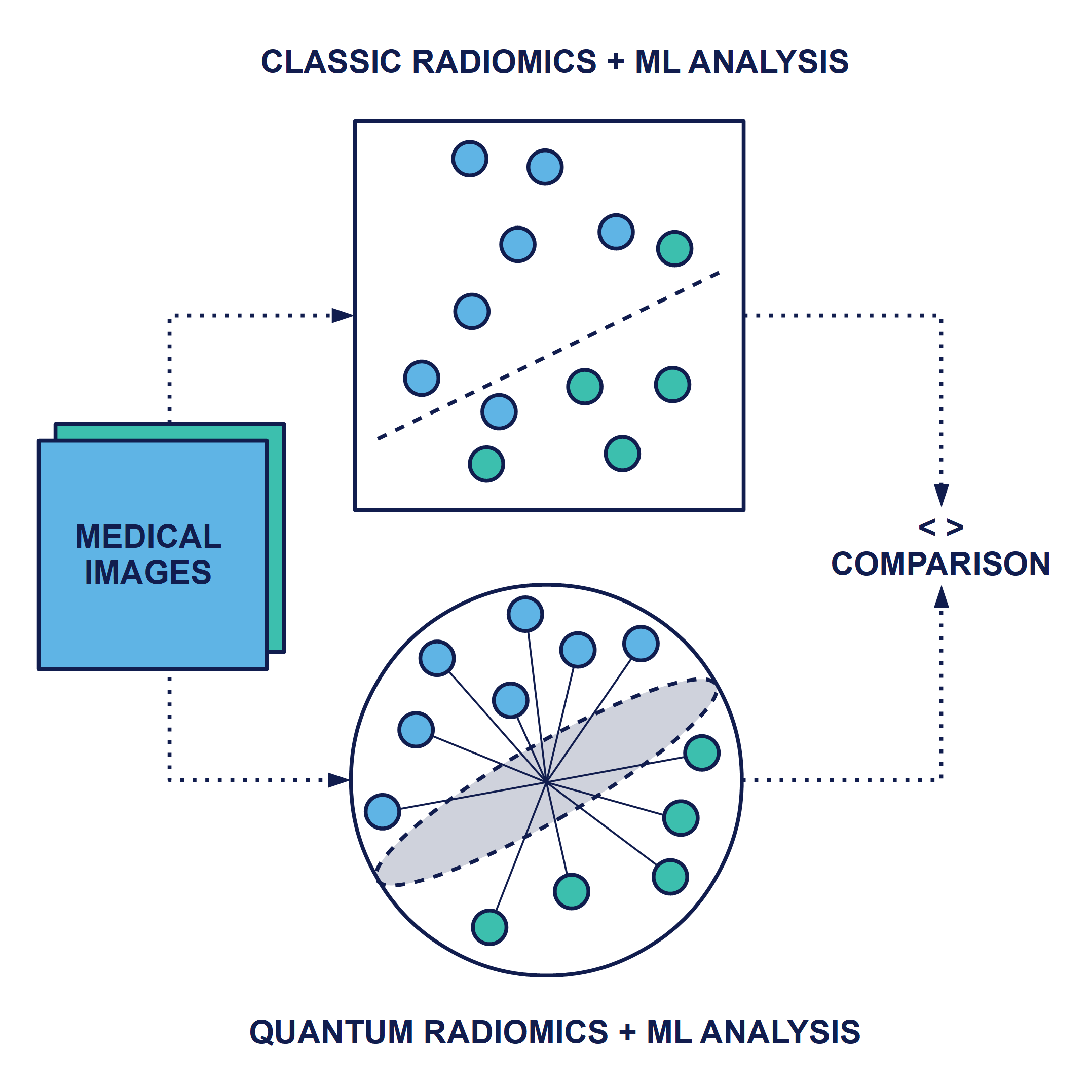 Radiomics is a process to extract various numerical features from medical images in order to analyte and predict form them by machine learning (ML) approaches. Deep learning approaches are considered superior to radiomics; however, they require large amounts of training data which is mostly not available. Previously proposed approaches imply that quantum feature extraction is possible by encoded medical images in the quantum domain, and that these quantum features have the potential to act as surrogates of both radiomic and deep features in one integrated, and simplified quantum circuit. Existing quantum machine learning solutions have been proven to bring benefit compared to their classical counterparts in various real-life datasets, including medical data, however, they still require classical data to be encoded before analysis. A native quantum feature extraction approach combined with native quantum machine learning can provide comparable or superior predictive performance compared to classic radiomics/deep learning and ML. Therefore, this project aims to investigate the added value of quantum radiomics + quantum ML in clinically-relevant imaging datasets.