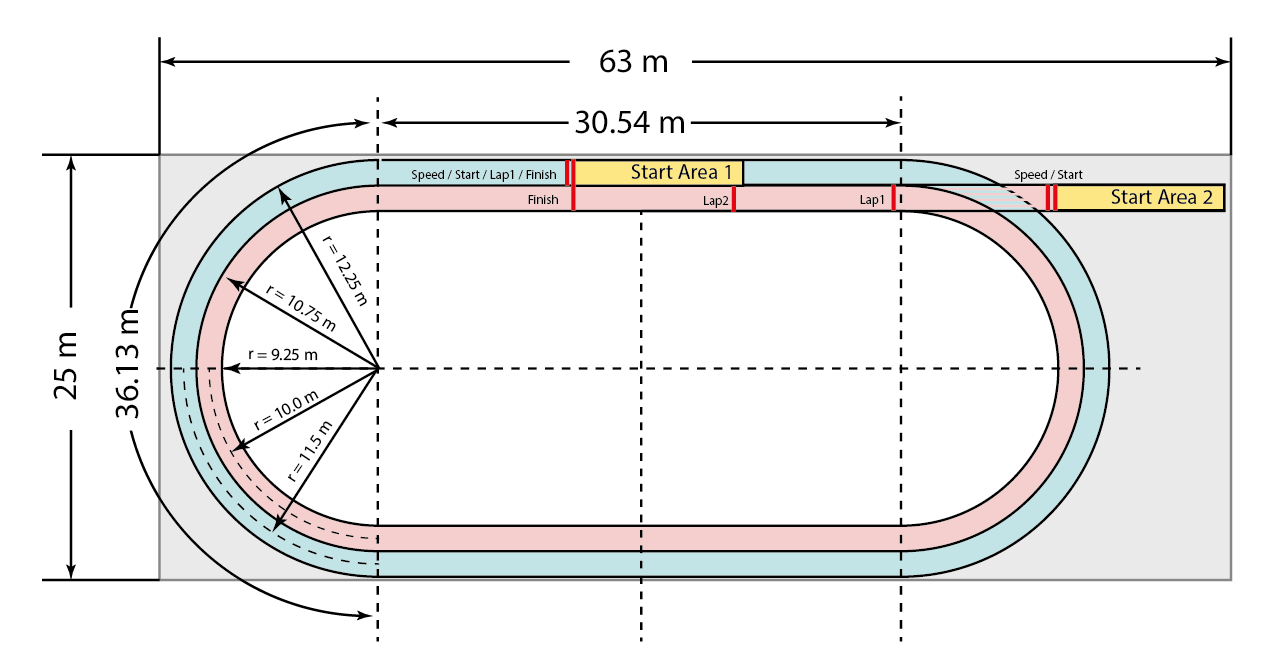 After a clear audible start signal, pilots are allowed to initiate the starting procedure. The pilot should exit the starting area within 30 s. Please note that the START line has to be crossed at a low speed (max. 5km/h). The pilot has to cover a total of 3 laps within a time limit of 5 min. Time measurement starts when the first wheel is crossing the START line. The time measurement stops when the first wheel is crossing the FINISH line or when the time limit is reached.