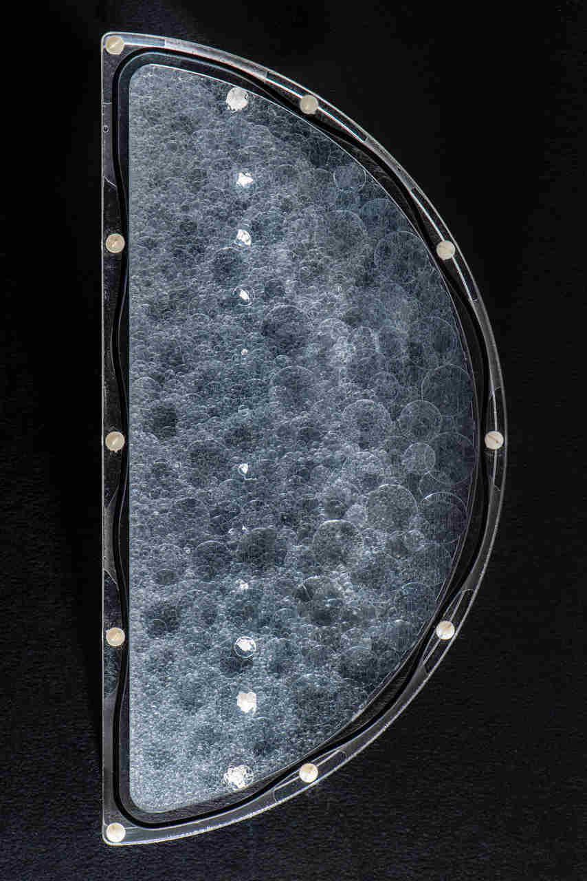 Die wichtigsten Merkmale des Phantoms sind: seine äußere Form – die einem halben Zylinder entspricht (200 mm Durchmesser, 48 mm Höhe), - die 3D-Hintergrundstruktur, die aus in Wasser getauchten PMMA-Kugeln mit verschiedenen Durchmessern besteht, und läsionsähnliche Modelle in verschiedenen Größen, die auf ihre Erkennbarkeit getestet werden können. Der Unterschied im Abschwächungskoeffizienten zwischen PMMA und Wasser entspricht in etwa dem Unterschied zwischen Fett- und Drüsengewebe. Das aktuelle Phantom besteht aus 4x fünf Clustern mit Mikroverkalkungen mit zunehmendem Durchmesser von 90 µm bis 250 µm, nicht nadelförmigen Läsionen, die auf realen Läsionsmodellen aus einer Datenbank basieren (von 1,6 mm bis 6,2 mm), und nadelförmigen Läsionen (immer das gleiche Modell mit unterschiedlichen Größen von 3,8 mm bis 9,7 mm mit Nadeln auf der Oberfläche).
