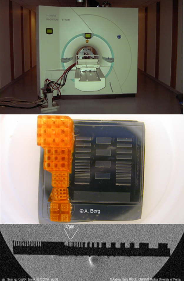 Wir haben einen starken Mikroskopie-Einsatz und mehrere empfindliche Hochfrequenz-Sensoren auf der Patientenliege eines für Human-Applikationen entwickelten Ultrahochfeld 7T-MR-Scanners implementiert. Zur Qualitätsbeurteilung wurden speziell entwickelte Testobjekte (Phantome) entwickelt, um die räumliche Auflösung mittels Modulationsübertragungsfunktionen in zwei und drei Dimensionen quantitativ zu überprüfen [Berg, Deutsches Patentamt, DE19904635]; [Berg et al. Proc. ISMRM 2010, progr nr. 1048]; [Berg et. al., Front. Phys. 2023].