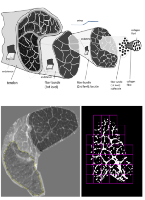 Es gibt eine Reihe von Geweben im menschlichen Körper (z.B. Sehnen, Meniskus, Zähne), die aufgrund des sehr schnellen Signalabfalls nicht hinsichtlich ihrer inneren Struktur sichtbar gemacht werden können. Methoden mit ultrakurzer Detektionszeit (UTE) in Verbindung mit der MR-Mikroskopie sind in der Lage, eine einzigartige morphologische Substruktur zu erkennen, z.B. die selbstähnliche Gewebeanatomie der Sehne (Abb. links). Auch die fraktale Dimension der selbstähnlichen Gewebetextur kann mit Hilfe von unterschiedlich Kontrast-gewichteten MR-mikroskopischen Daten und spezieller Datenverarbeitungssoftware ausgewertet werden [Berg et al. Proc. ISMRM 26, 2831 (2018)].