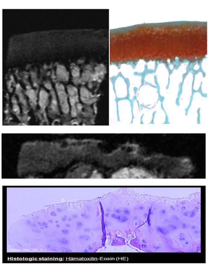 Obwohl die MR-Mikroskopie nicht die hohe Auflösung der Lichtmikroskopie erreichen kann, lassen sich Multi-Schicht-Bilder mit unterschiedlichem Kontrast mit einer Pixelgröße von etwa 30x30 µm2 erzeugen, was für die Erkennung von z.B. osteoarthritischen Veränderungen im Knorpel ausreichend ist. Der Hauptvorteil der MR-Mikroskopie mit unterschiedlich gewichteten Kontrastparametern liegt in der nicht-invasiven Bildgebung, ohne dass die Probe in dünne Scheiben geschnitten werden muss. Auch einige Färbevorgänge können vermieden werden, da die MR die Gewichtung des Signals mit unterschiedlichen Kontrastparametern ermöglicht (z.B. sd, T1, T2, T2*, Suszeptibilität, DWI, MT, ...) [Berg et. al. Proc. ECR EPOS #2914 (2011)], [Hager et. al., JMRI, 2022].