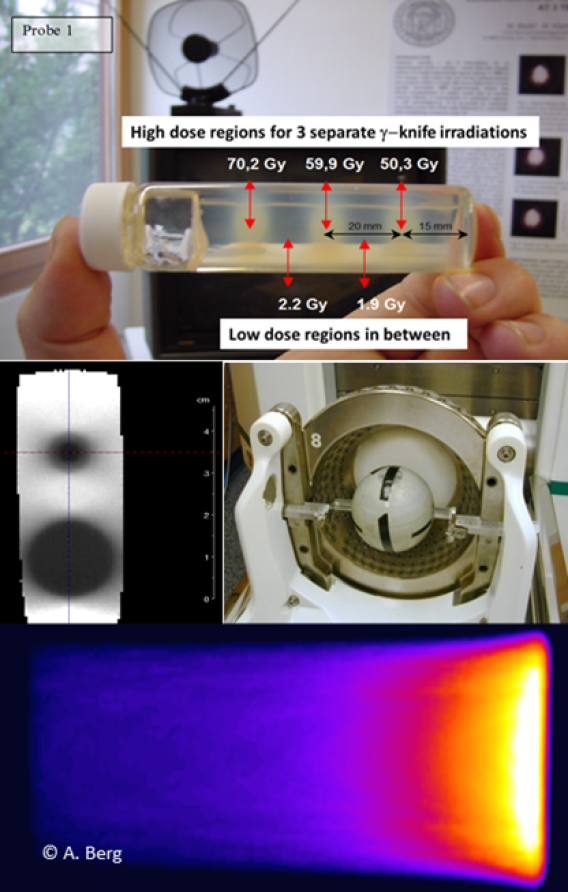 In der Strahlentherapie zur Tumorbehandlung stellt die Dosimetrie von kleinen Strahlenfeldern (Photonen oder Teilchen (z.B. Protonentherapie) aufgrund der relativ großen Ionisationskammern und der langen Meßzeit für einen vollständigen Volumendatensatz ein kritisches Problem dar. Mehrschichtige (3D) dosimetrische Bilder können durch T2-Parameter- selektive Bildgebung (T2-Maps) gewonnen werden. Die T2-µ-Bildgebung ermöglicht eine hochauflösende 3D-Dosimetrie kleinster Bestrahlungsfelder für die Tumortherapie in der klinischen Routine, z.B. mit γ-knife (mittleres Bild). Auch die Visualisierung von mm-großen Dosis-Bragg-Peak Spitzen-Dosiswerten am Ende der Partikeltherapie (unten) ist möglich [Khan et. al. Polymers 11(10): 1717 (2019)].
