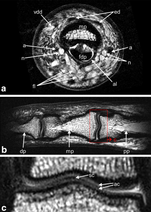 Unsere selbst entwickelten hochempfindlichen Hochfrequenzspulen ermöglichen die Mikrobildgebung menschlicher Extremitäten in vivo an einem Ultrahochfeld-MR-Scanner (7T). Mit einer speziellen Fingerspule ist es möglich, die inneren Strukturen des menschlichen Fingers in vivo in patientengerechter Messzeit darzustellen. Verschiedene anatomische Merkmale wie Knochen und Knochenmark, Sehnen und Ringbänder, Knorpel, Arterien und Venen, Nerven und Vater-Pacinische Tastkörperchen können mit einer Pixelgröße von etwa 80×80 µm2 dargestellt werden. Dies kann zur Diagnose und Behandlungsüberwachung bei Pathologien dienen, die von entzündlichen oder erosiven Gelenkerkrankungen über Verletzungen von Sehnen und Bändern bis hin zu Nerven- oder Gefäßstörungen im Finger reichen (Laistler et al. Magn Reson Med 79:588–592, 2018).
