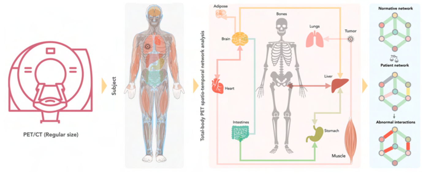 The human body is a complex system acting on multiple interactions of numerous organs to ensure the organism’s proper functioning (homeostasis). Diseases may occur when such homeostatic balance supported by inter-organ communication is interrupted. Positron emission tomography (PET) is a widely available imaging method that can be used to examine the metabolic function of the human body non-invasively and quantitatively.